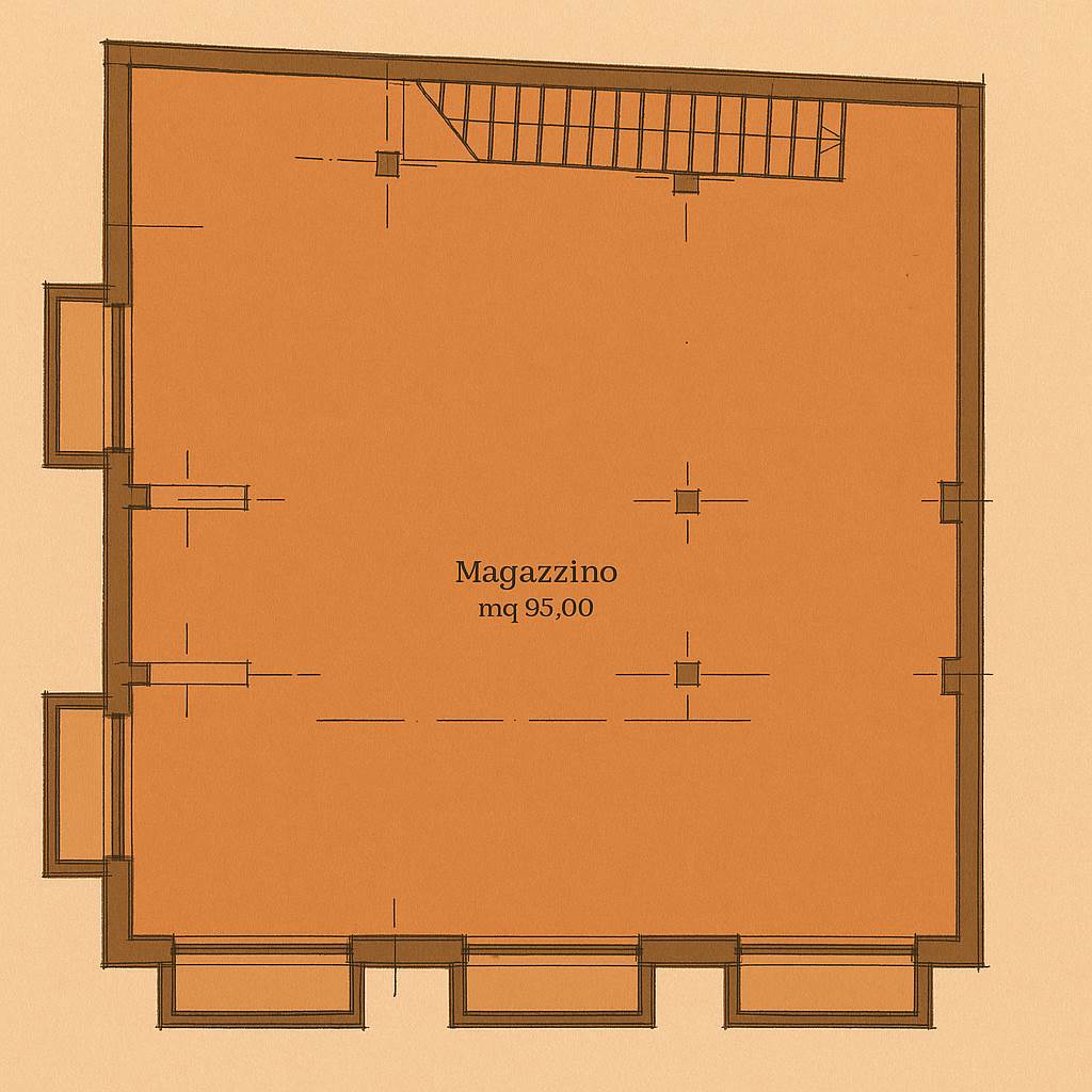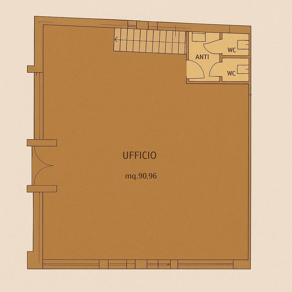 L'ufficio al piano terra misura circa 90 mq con doppio servizio igienico, il magazzino, al piano interrato, misura circa 95 mq.