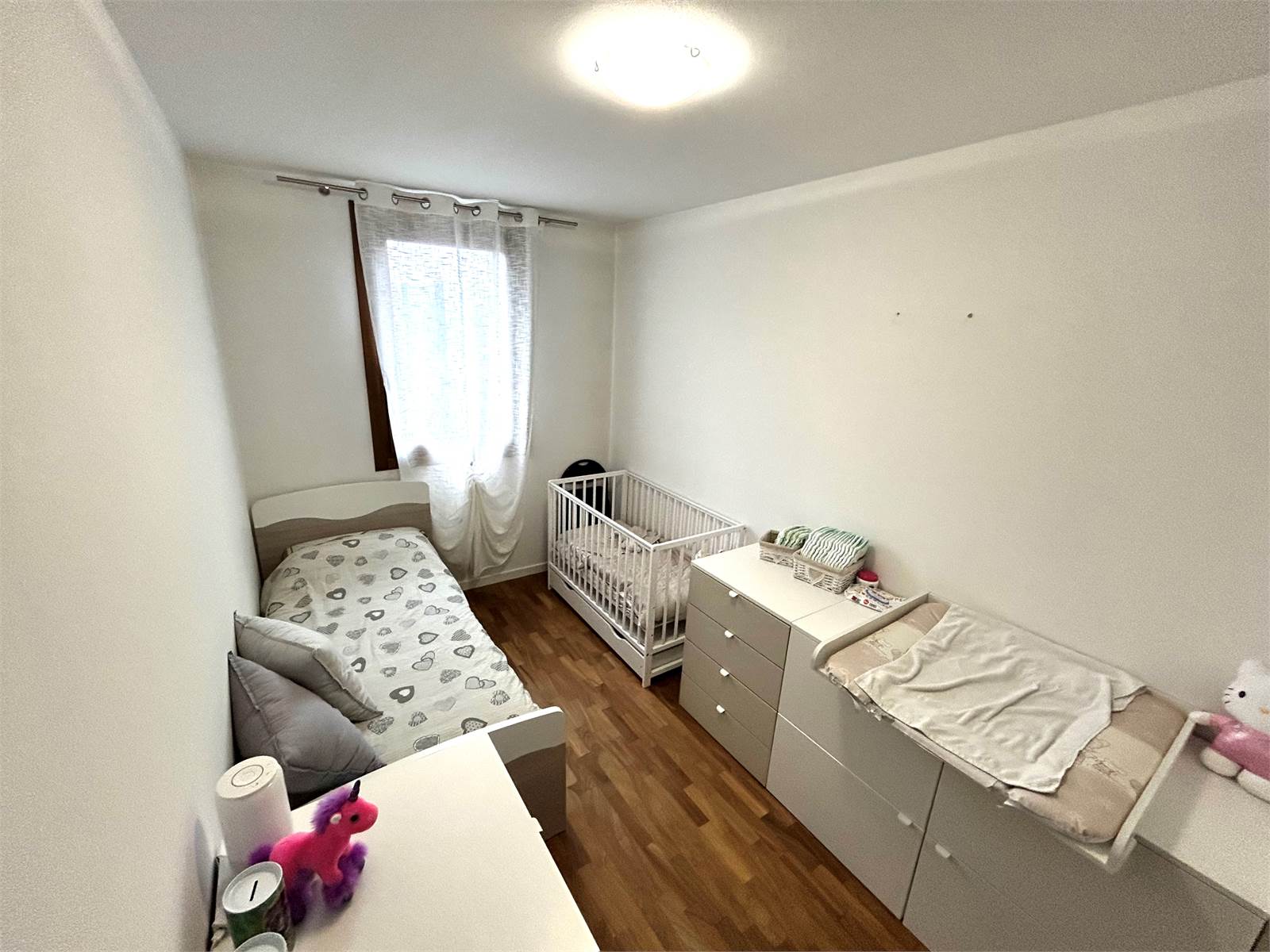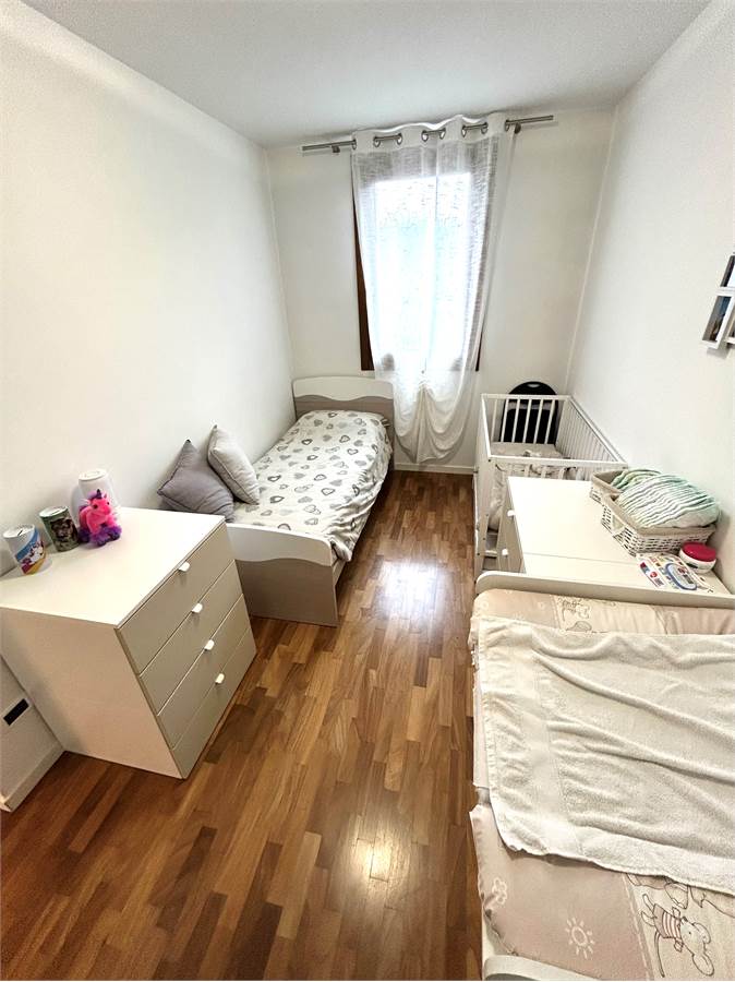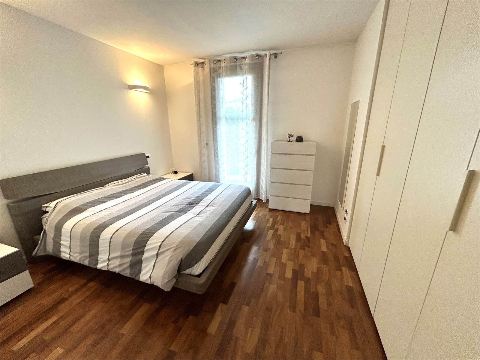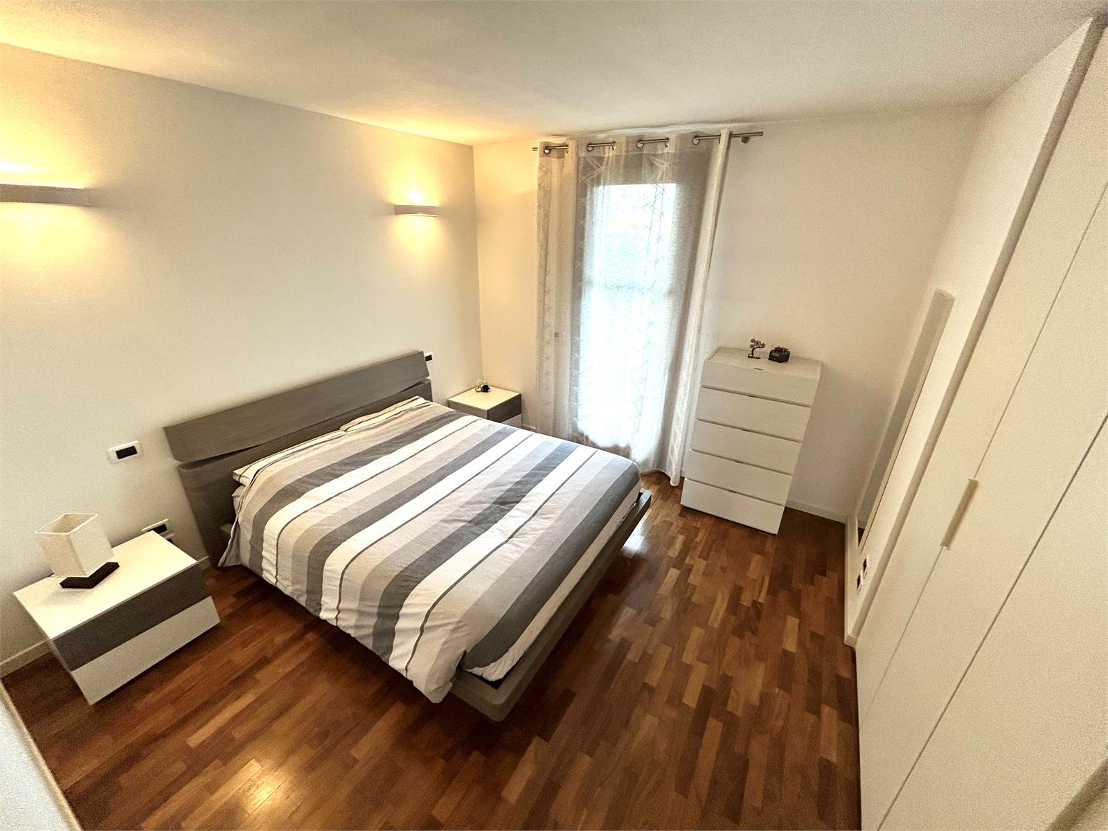 La zona notte è composta da una camera matrimoniale di generosa metratura con armadio a muro a sei ante, una camera singola, un bagno con doccia e un altro bagno (attualmente utilizzato come ripostiglio) oltre ad un disbrigo arredato con armadiatura su misura.