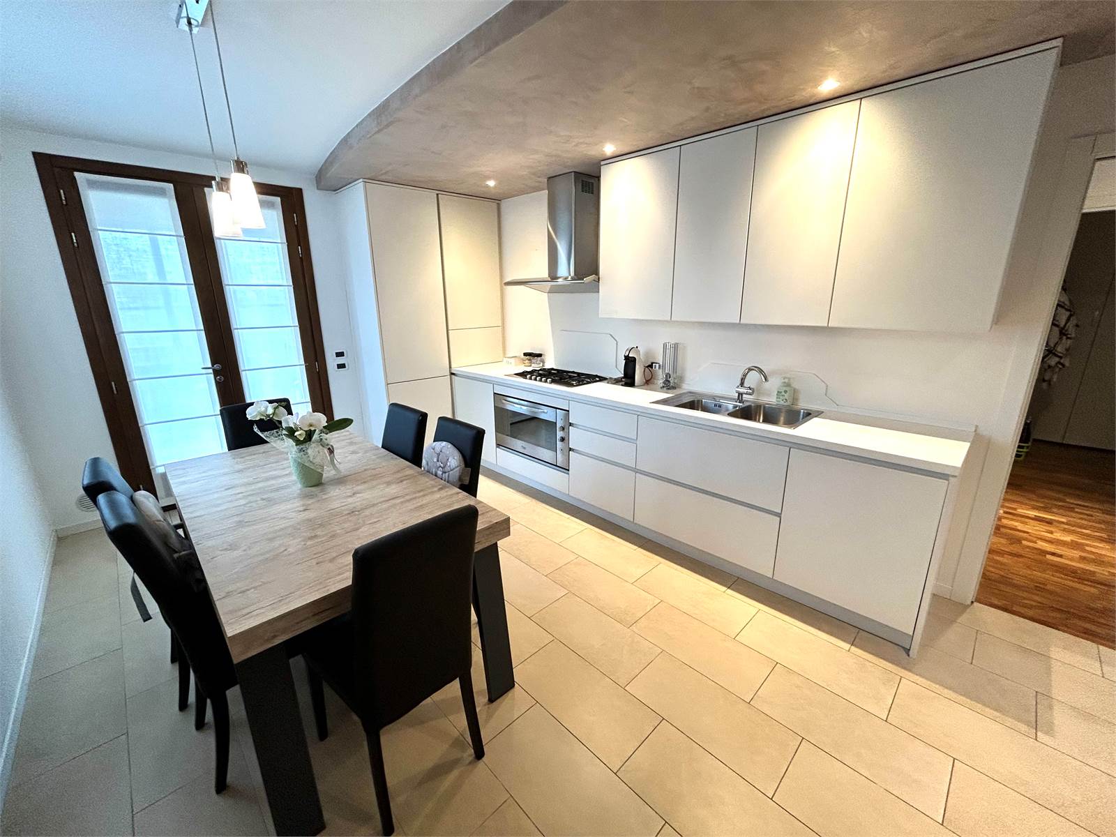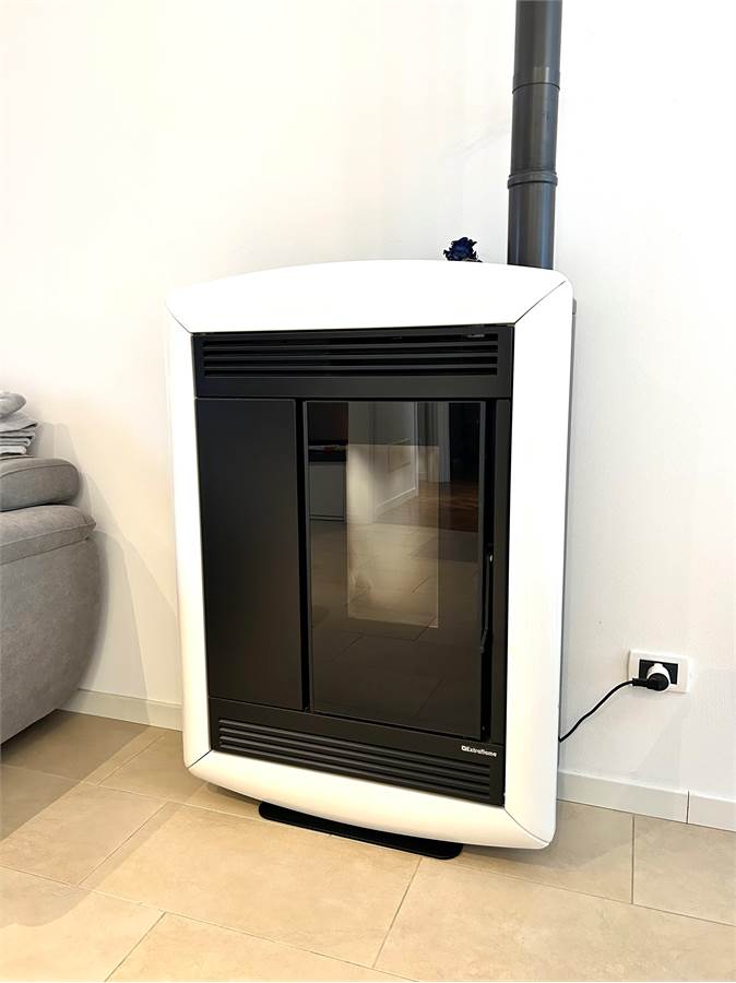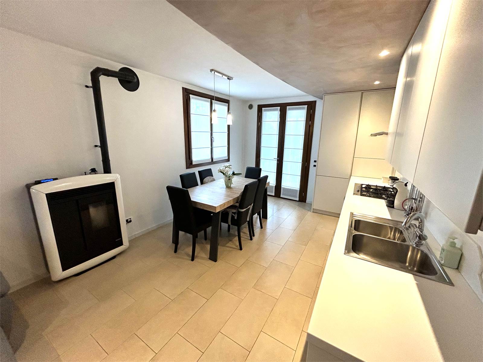 L'appartamento offre la comodità di un'ampia zona giorno open space con stufa a pellet e cucina a vista e con doppia uscita verso l'esterno.