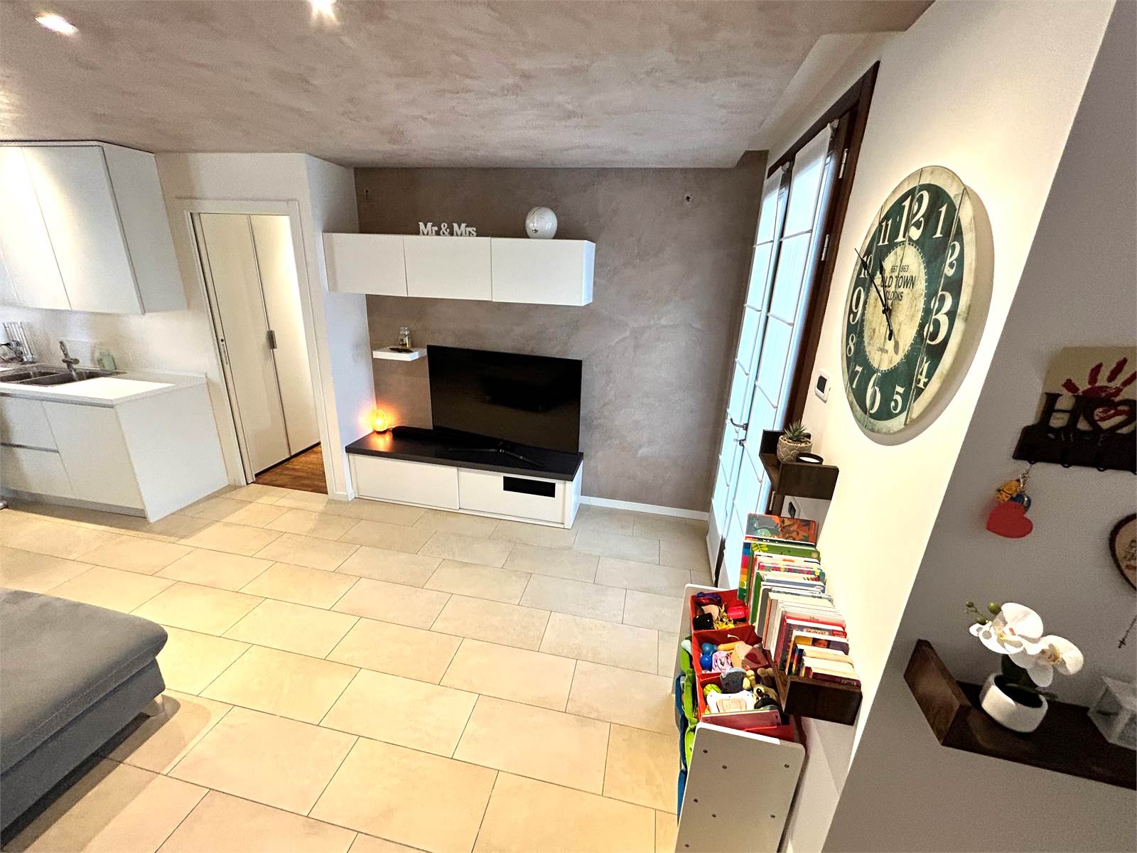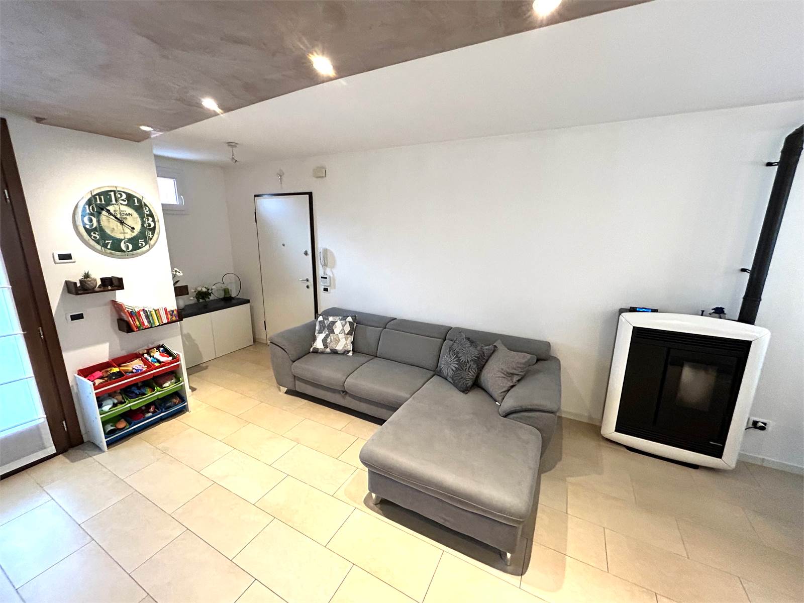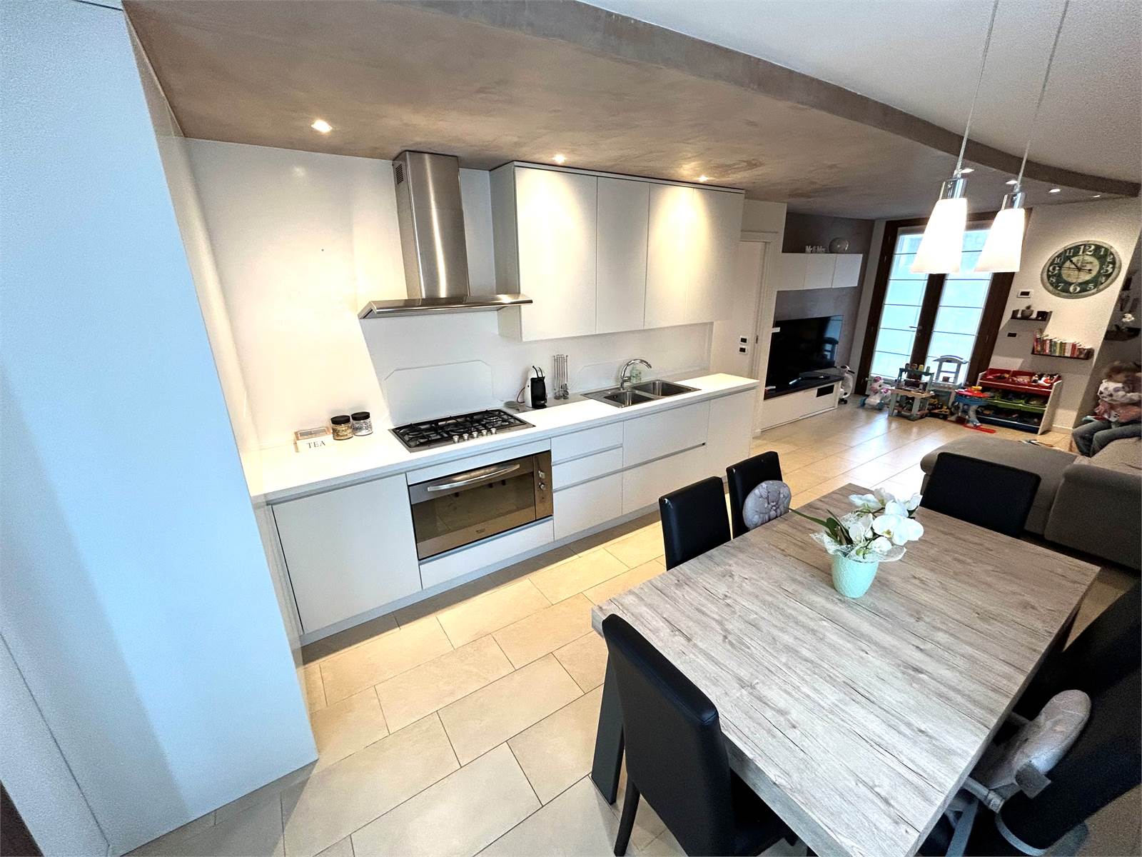 L'appartamento offre la comodità di un'ampia zona giorno open space con stufa a pellet e cucina a vista e con doppia uscita verso l'esterno.