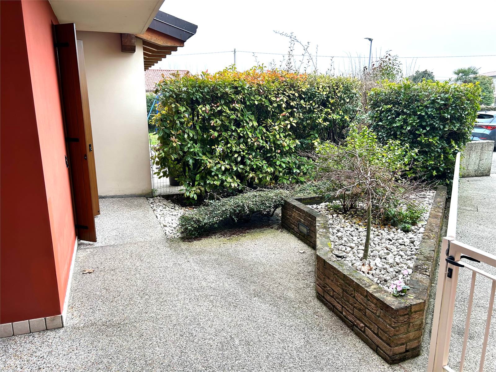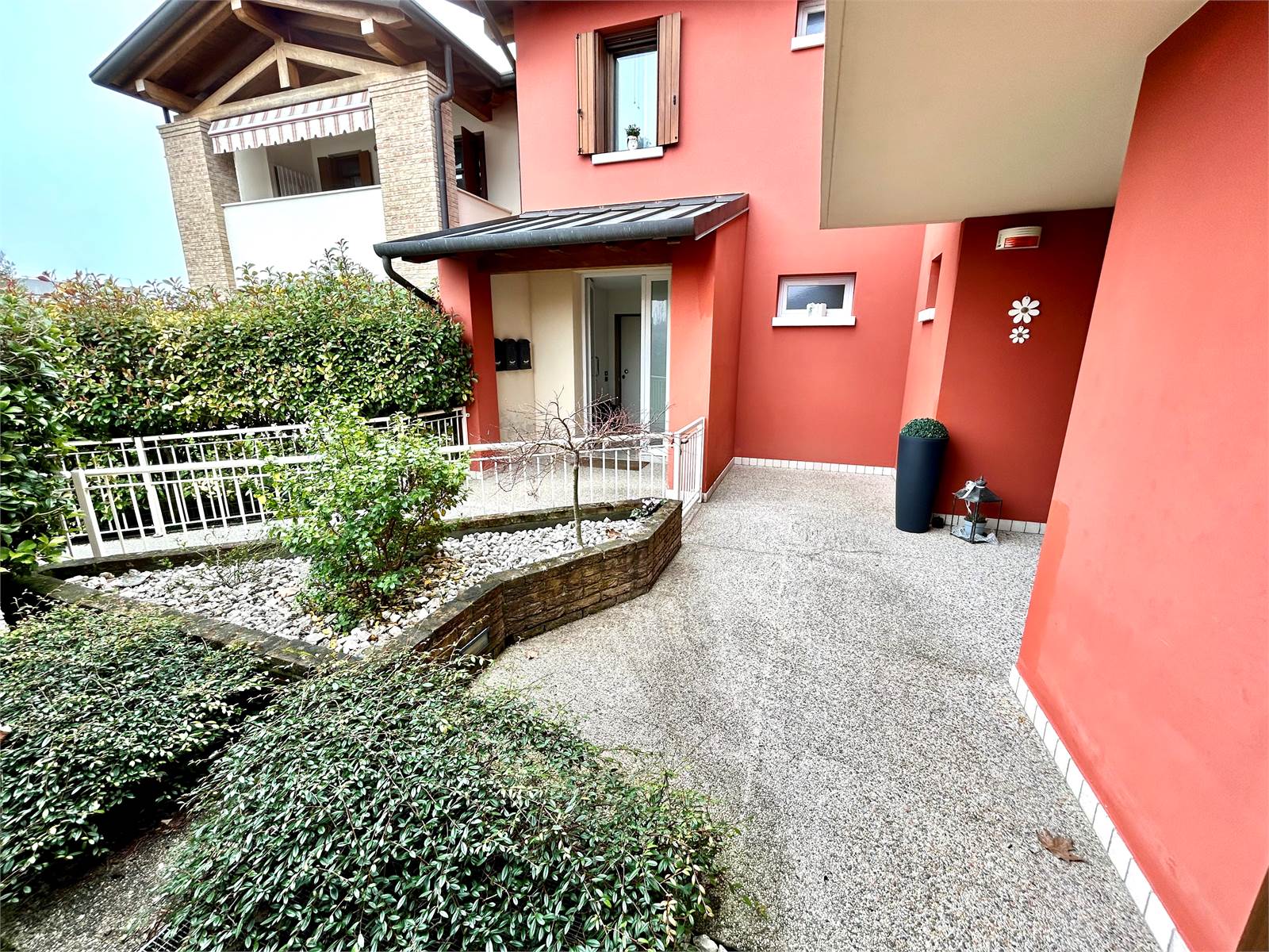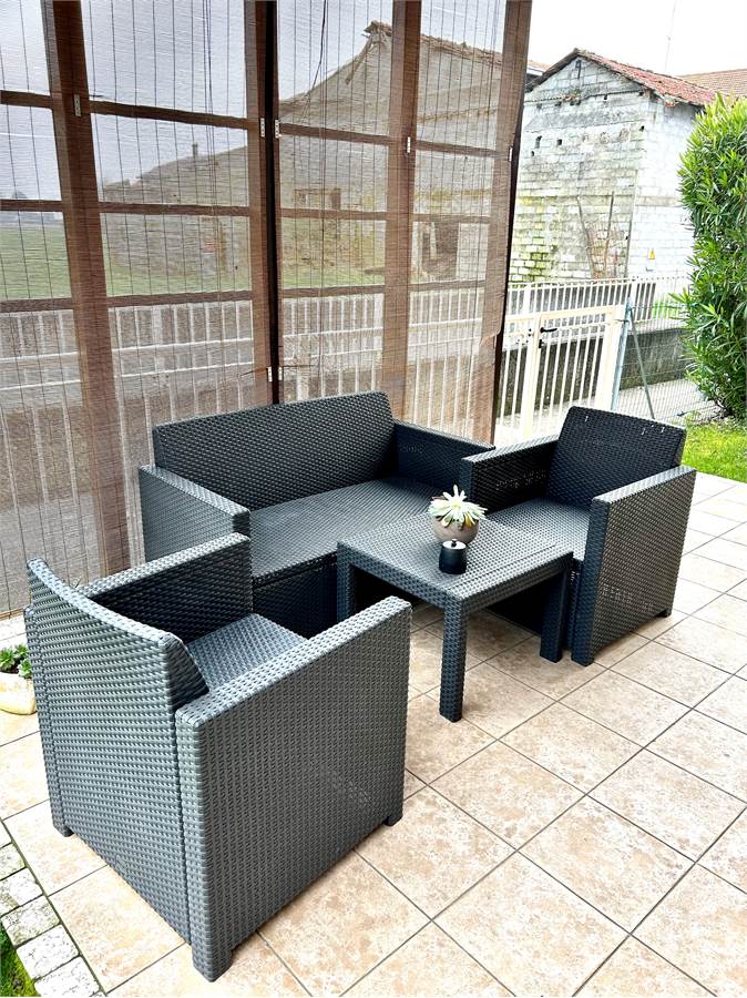 Il giardino è presente sia sul fronte che sul retro dell'appartamento e si estende anche ad un'area collegata raggiunta da camminamento, ideale per essere adibita ad orto. Dal lato della cucina, l'esterno fruisce della comodità di una pompeiana, dove un salottino consente di vivere momenti di relax.