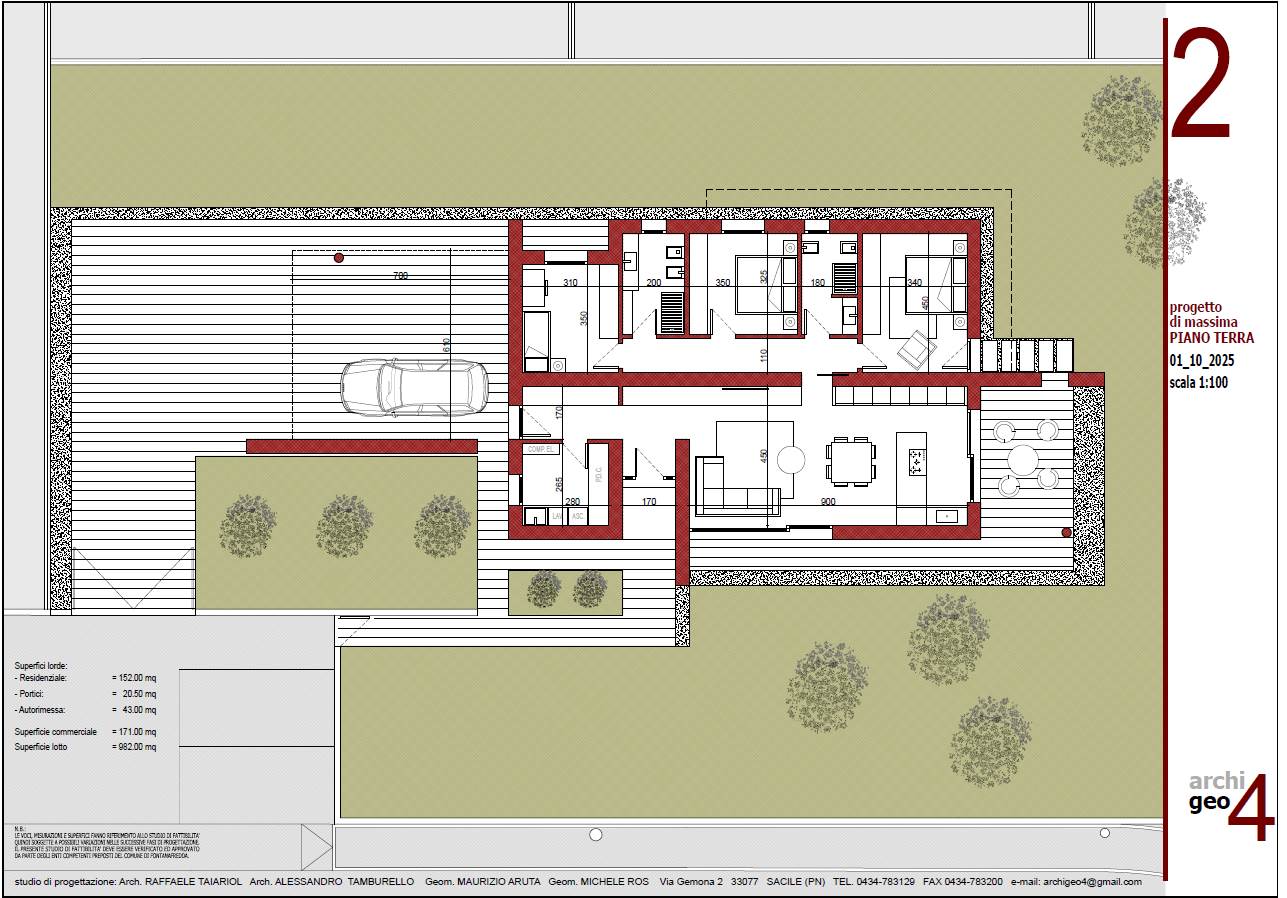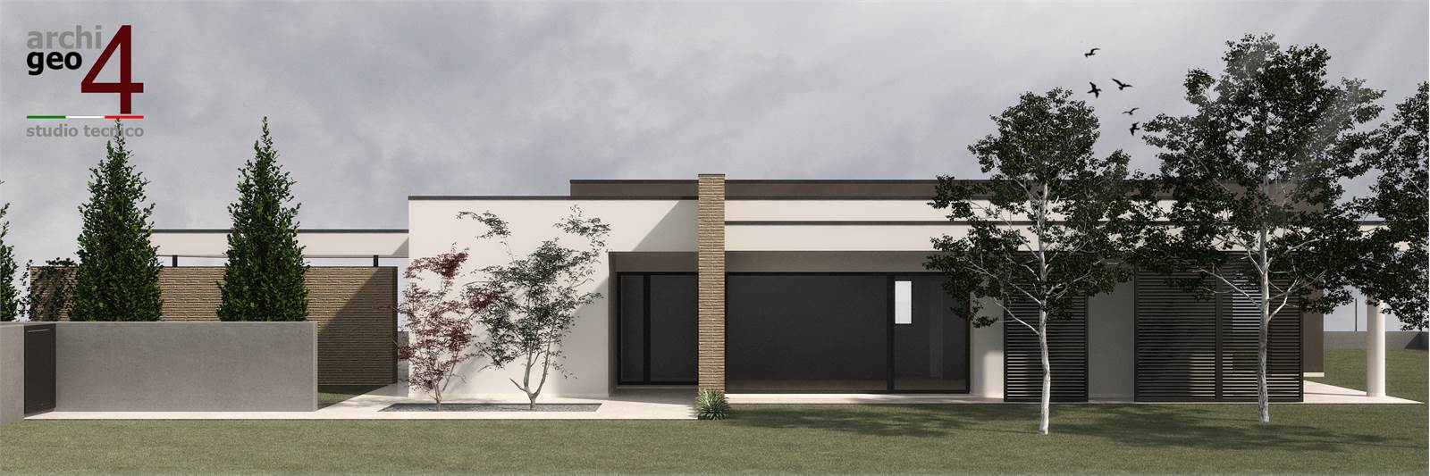 L'ingresso all'abitazione avviene attraverso comoda loggia e attraverso l'autorimessa. La zona giorno open-space si caratterizza per la sua luminosità grazie alle ampie aperture, che permettono l'uscita verso il giardino e il porticato dove poter trascorrere momenti di convivialità. Il comodo vano tecnico/lavanderia completa la zona living. Il disbrigo centrale si dirama nelle tre camere da letto, di cui due matrimoniali e una singola, e due bagni completi di doccia. L'autorimessa doppia completa l'abitazione.